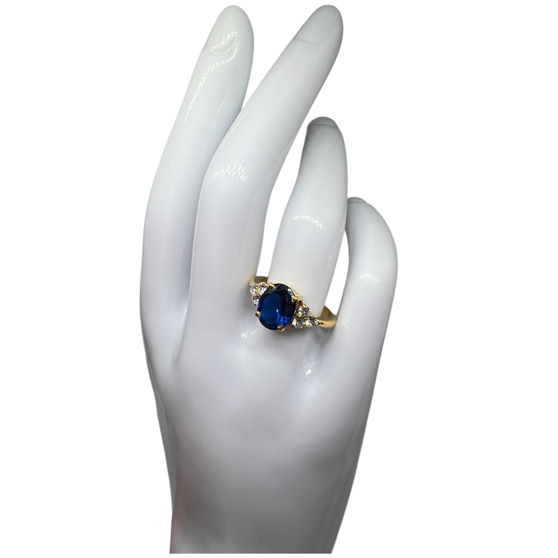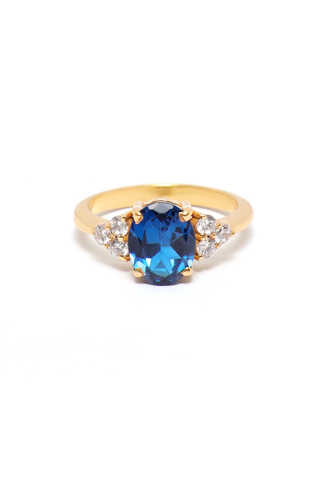 A captivating blue centre stone, complemented by a trio of zircons on either side. With its balanced design and geometric charm, this ring exudes understated elegance.