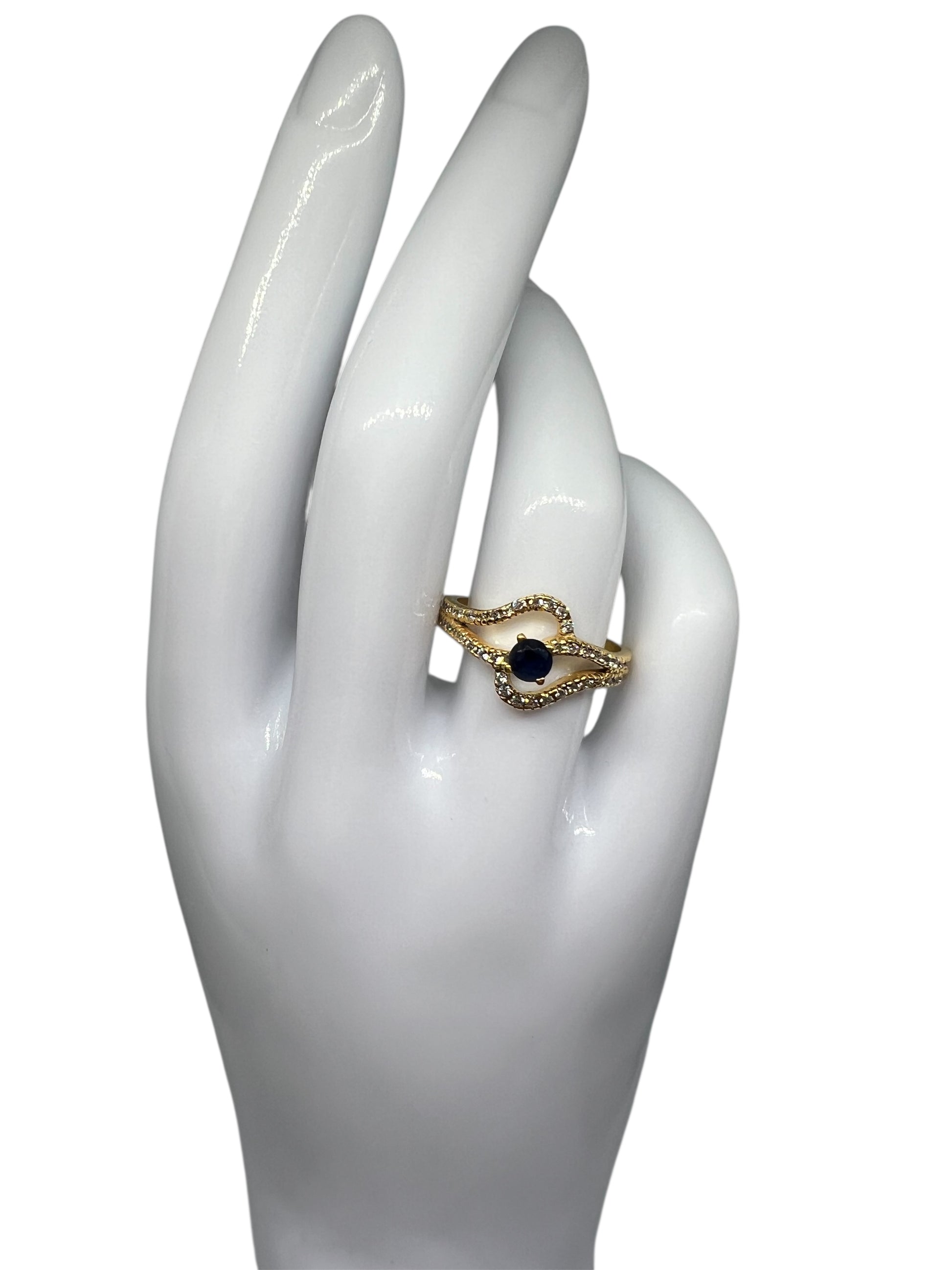 A tear-shaped design with zircons along the band, featuring a blue stone that connects the top and bottom for a refined, fluid look.