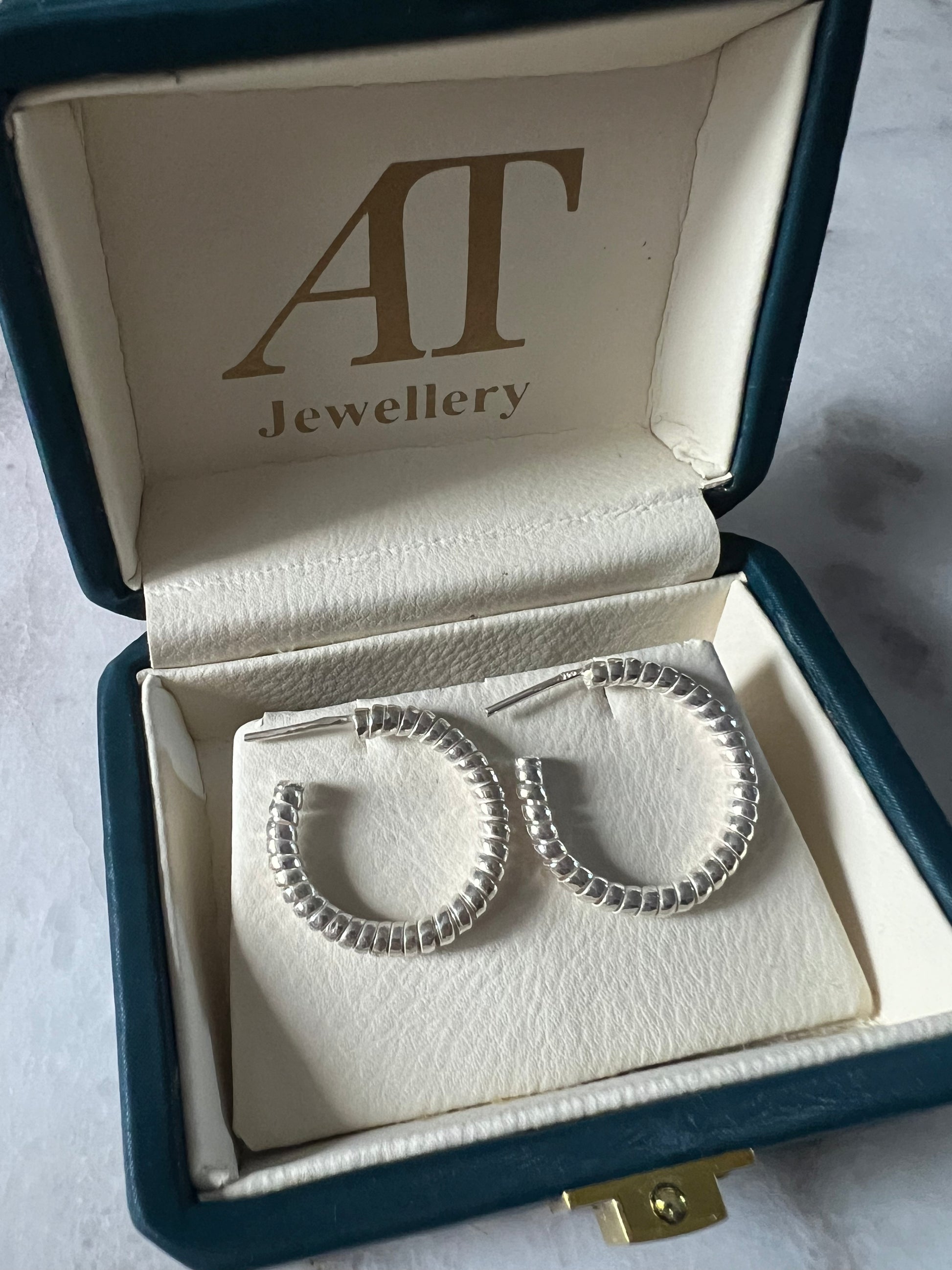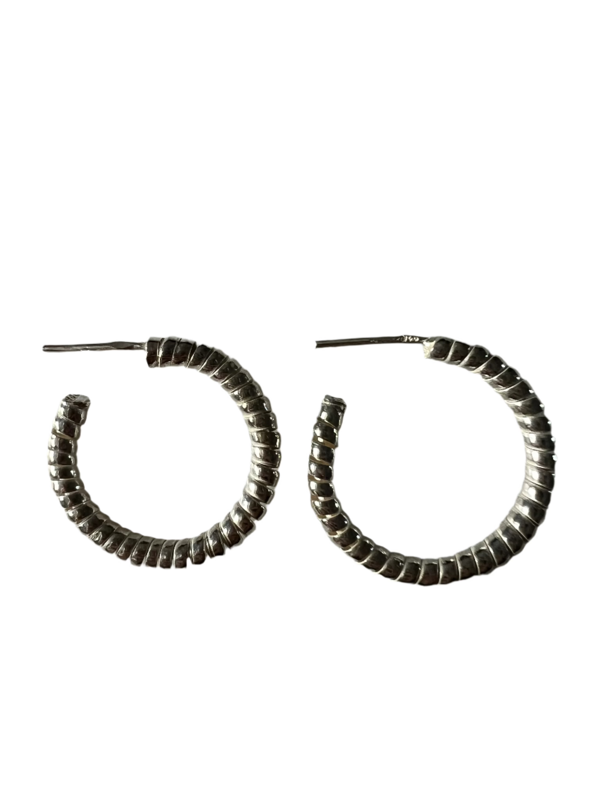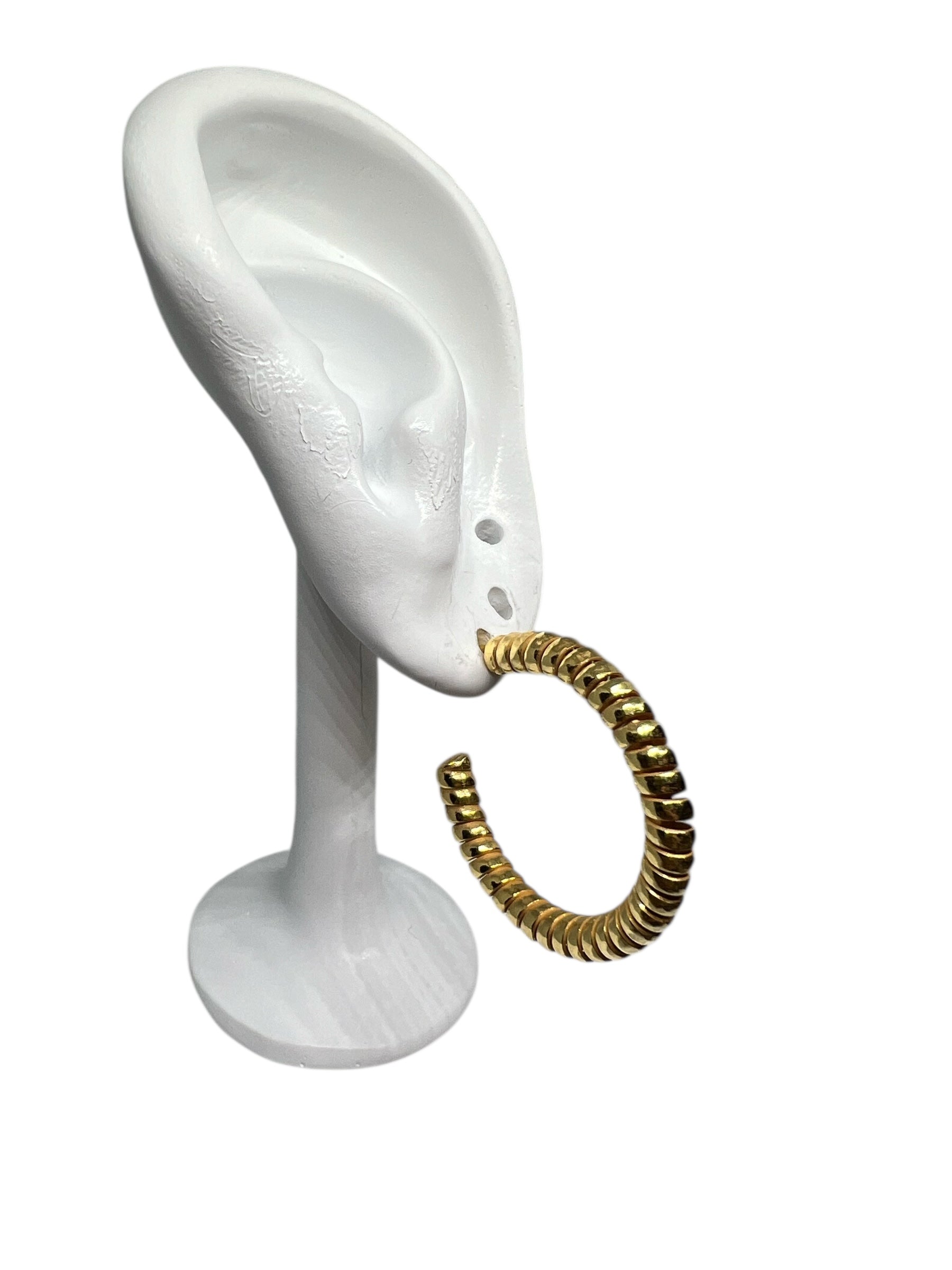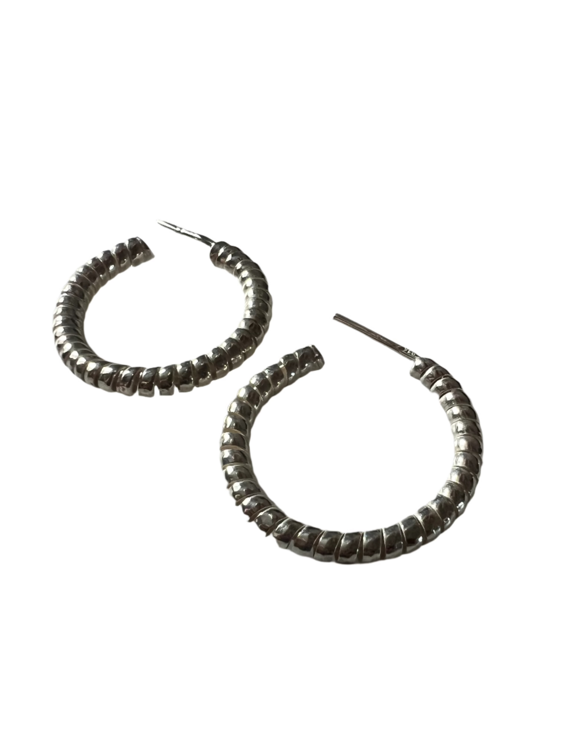 Vi introducerer Aria Hoops, udformet med et slankt spiraldesign, der udstråler elegance og moderne flair. Disse bøjler er designet til at fremhæve ethvert ensemble med deres yndefulde silhuet og tidløse appel. Perfekt til både afslappede og formelle lejligheder, Aria Hoops er et statement, der fanger essensen af ubesværet stil.