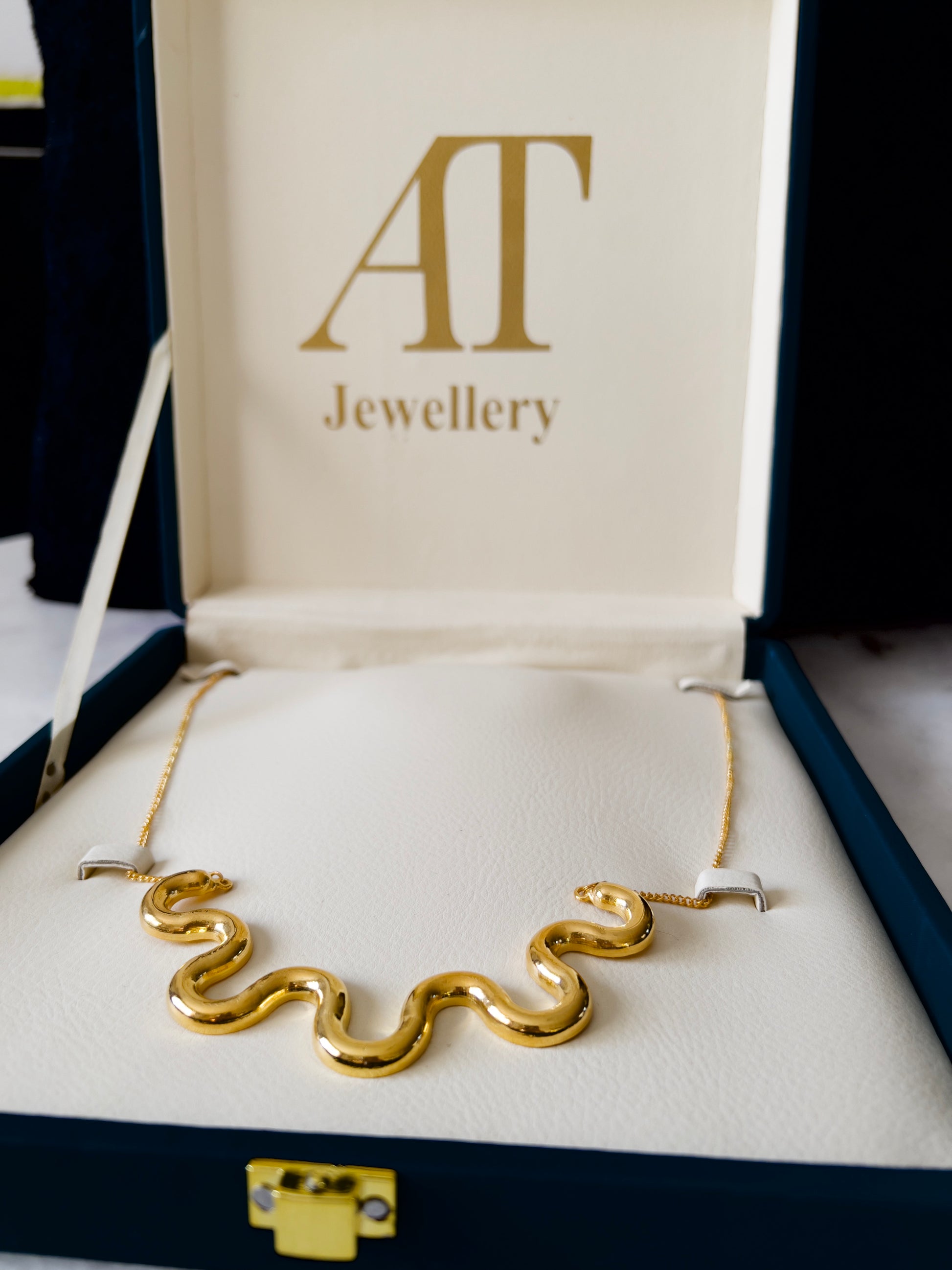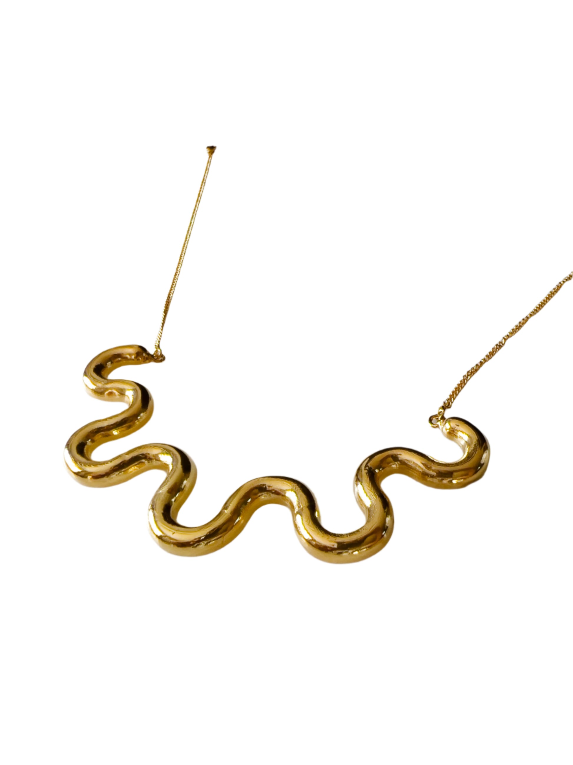 Præsenterer Aurum Wave-halskæden. Med sine yndefulde, bølgende kurver i strålende guld, er denne halskæde et udtryk for sofistikering og moderne elegance, perfekt til at tilføje et strejf af raffineret stil til ethvert outfit.