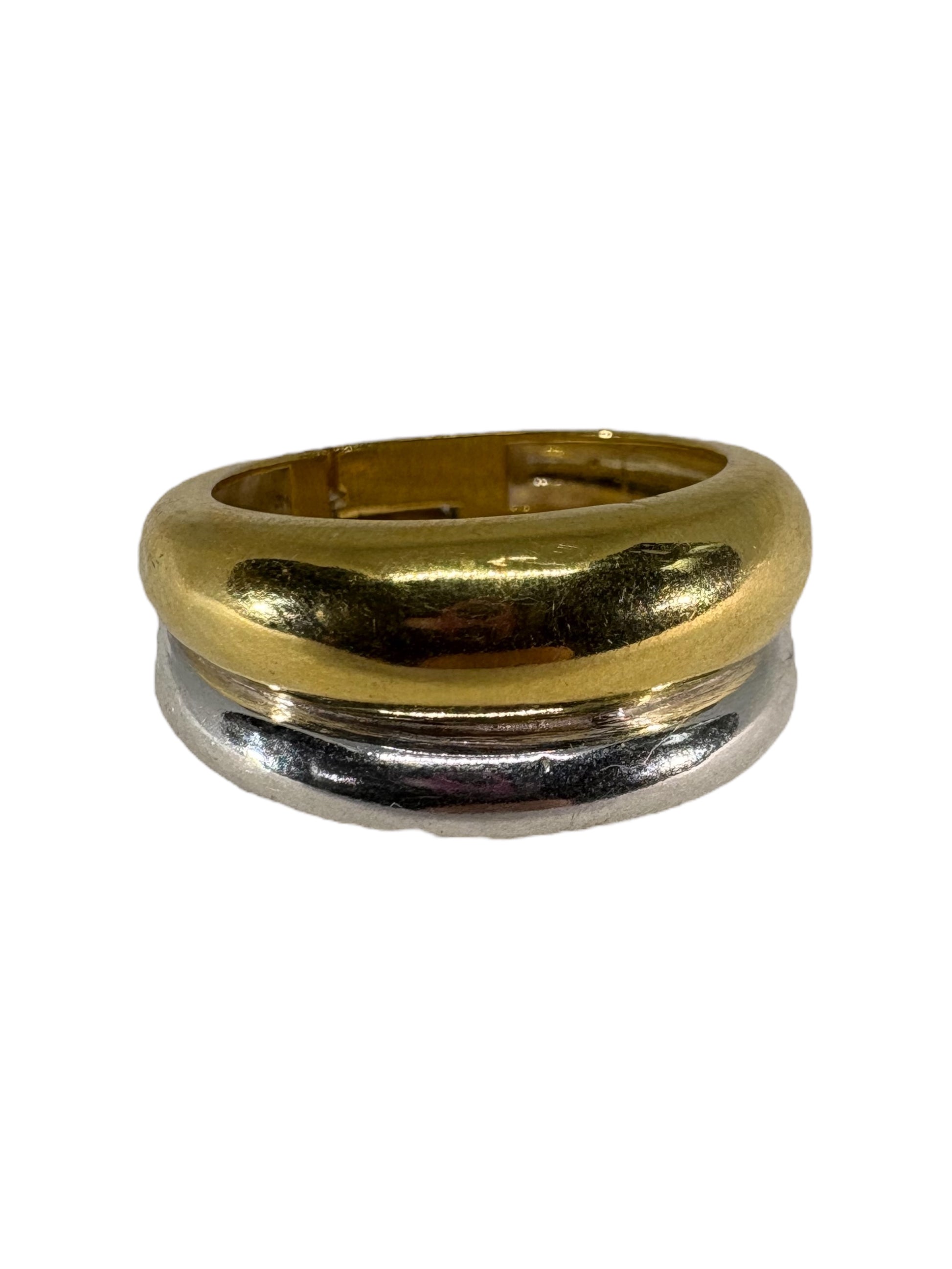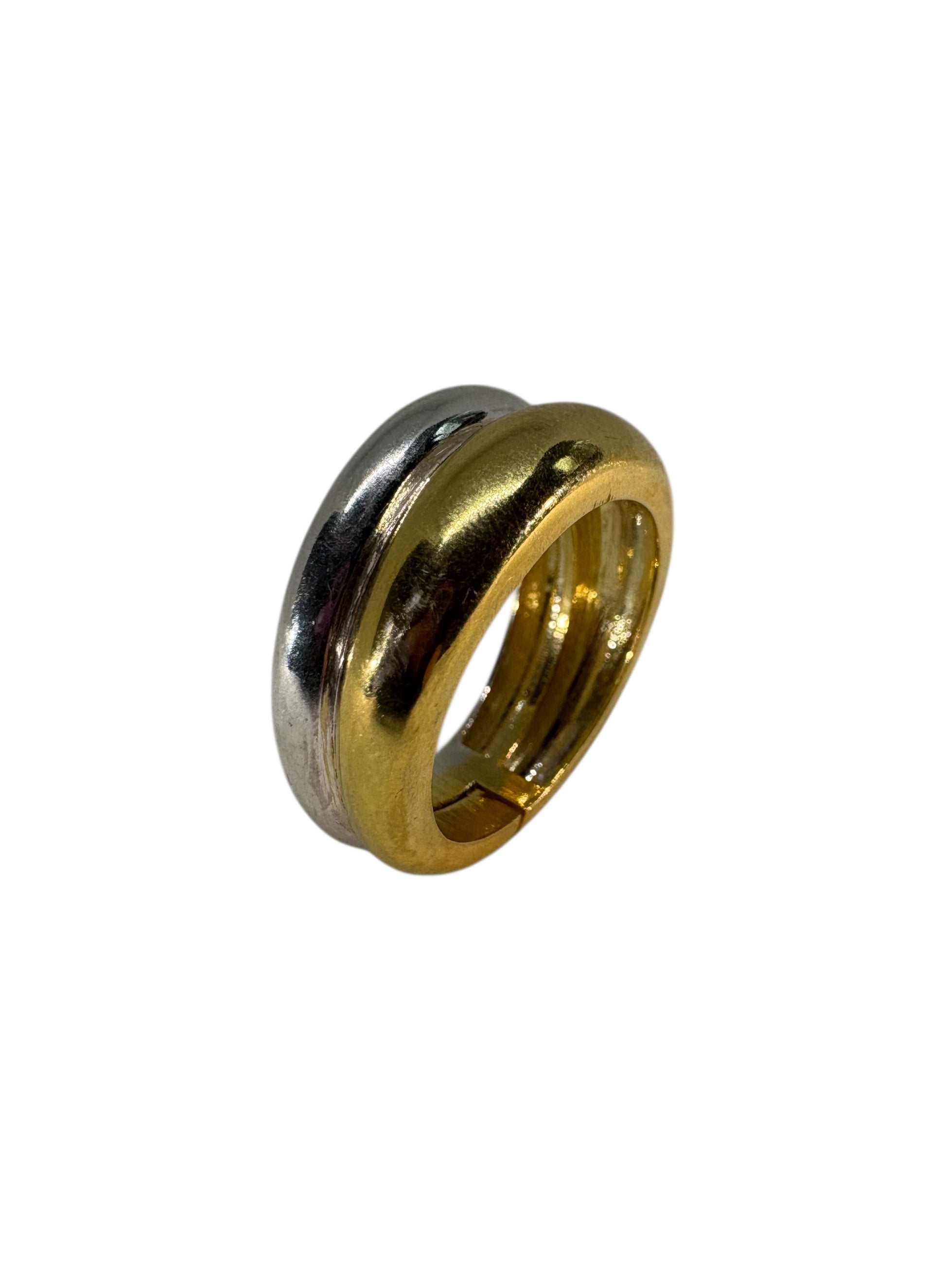 Et minimalistisk ringdesign, hvor guld og sølv blandes problemfrit. To kuplede cirkler skaber et elegant udtryk.