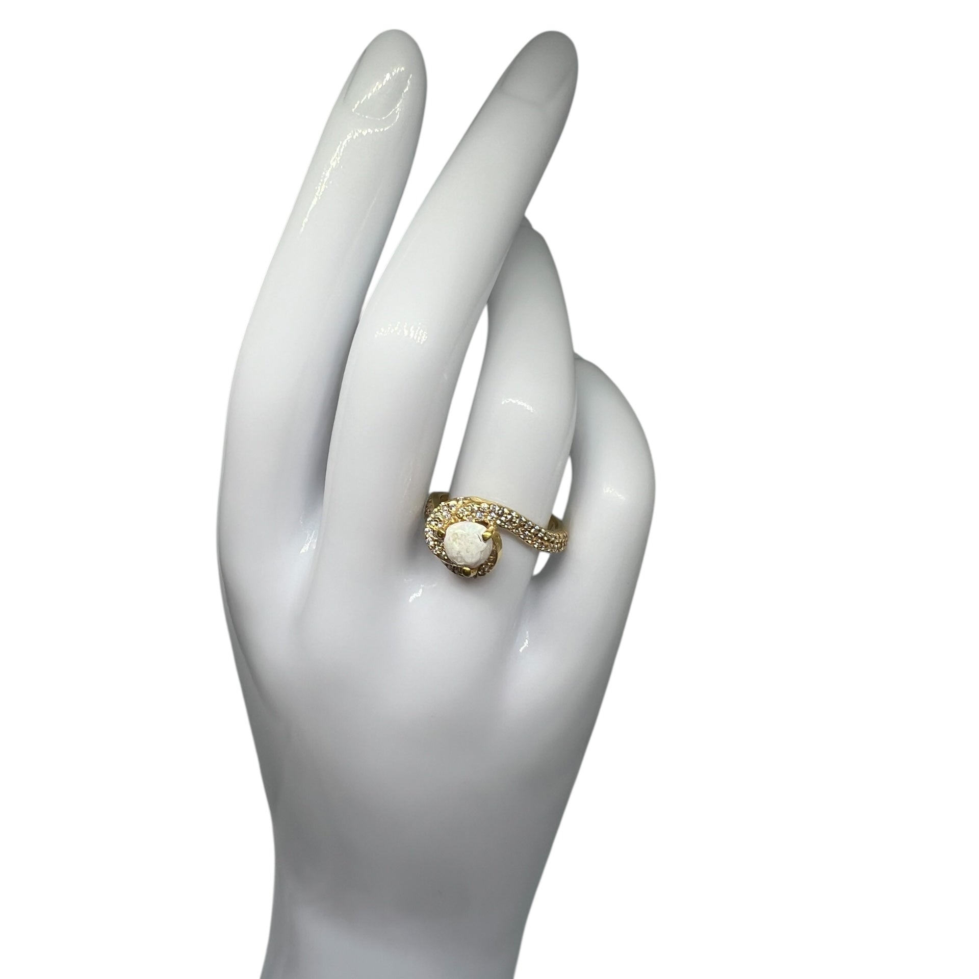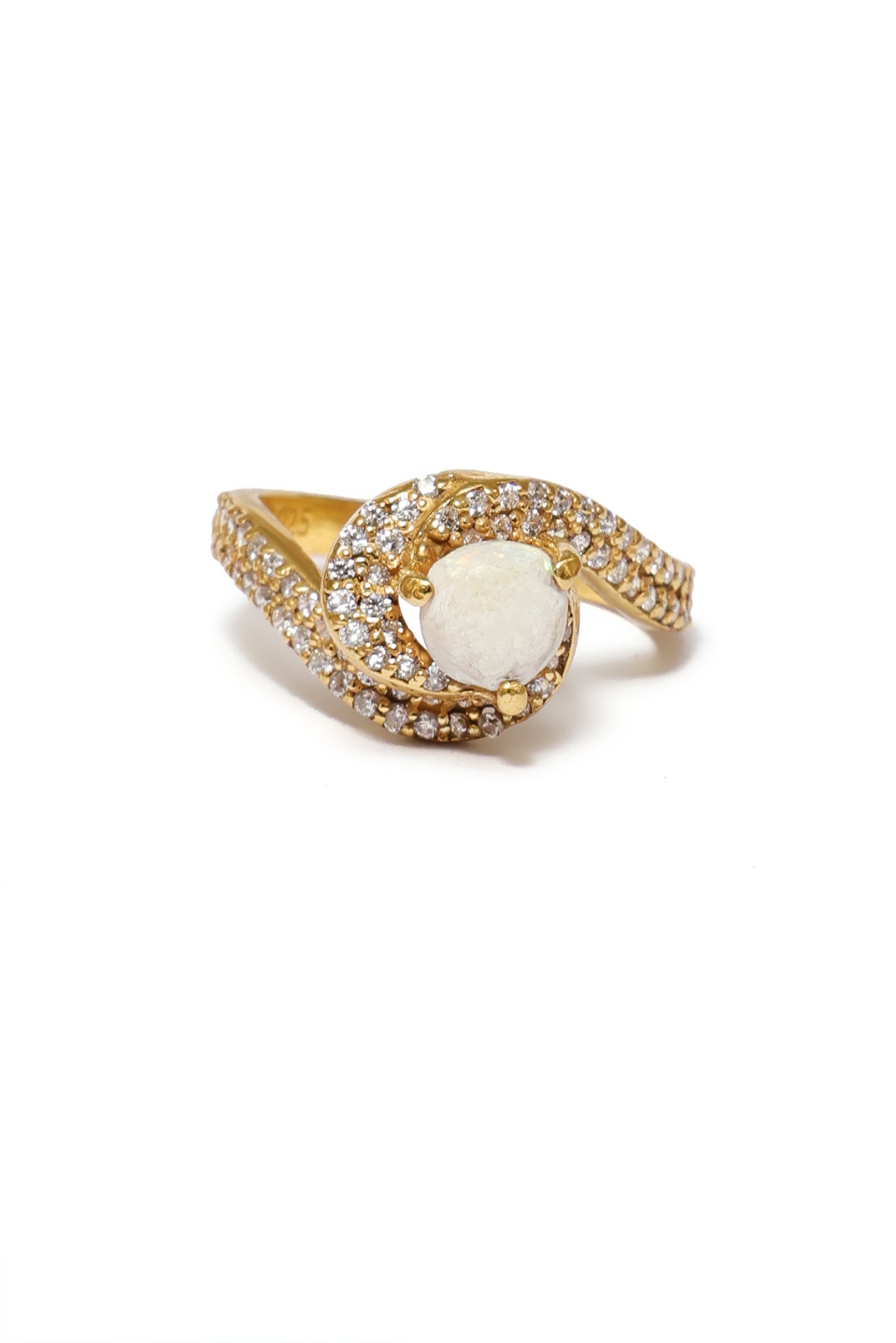 En lysende månesten omgivet af et zirkonbelagt bånd, der yndefuldt omslutter den og blander elegance med diskret glimmer.