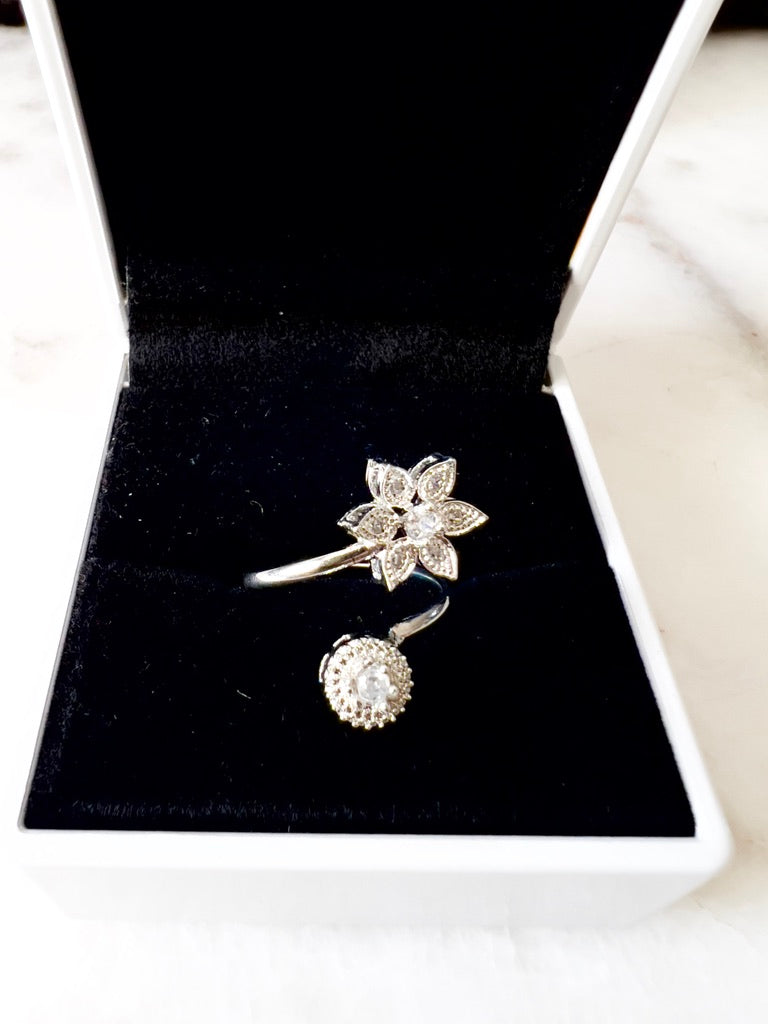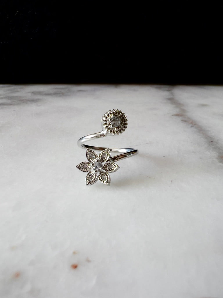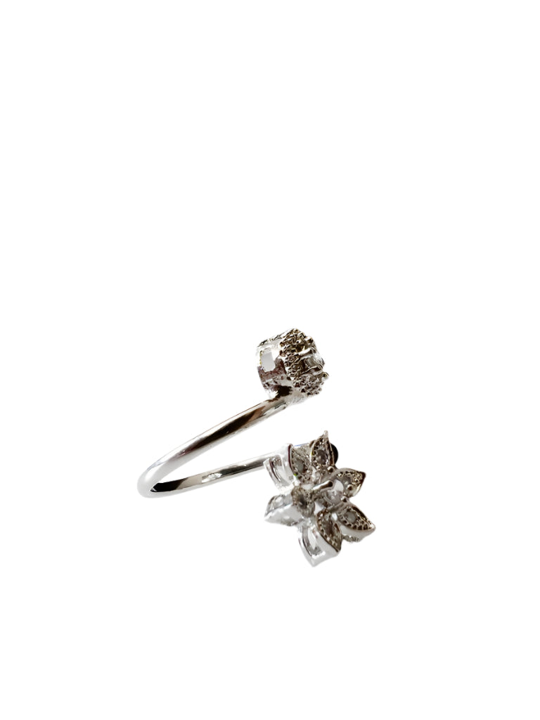 Helena-ringen har et elegant udformet åbent bånd-design, hvor den ene ende rejser sig for at afsløre et fembladsmotiv, og den anden buer til et karakteristisk cirkulært element. Udsmykket med glitrende zirkoner, inklusive en slående central sten i hver del, kombinerer denne ring smukt klassisk sofistikering med moderne flair. Helena-ringens unikke design og raffinerede detaljer gør den til et fremtrædende stykke, perfekt til at tilføje et strejf af tidløs elegance til ethvert ensemble.