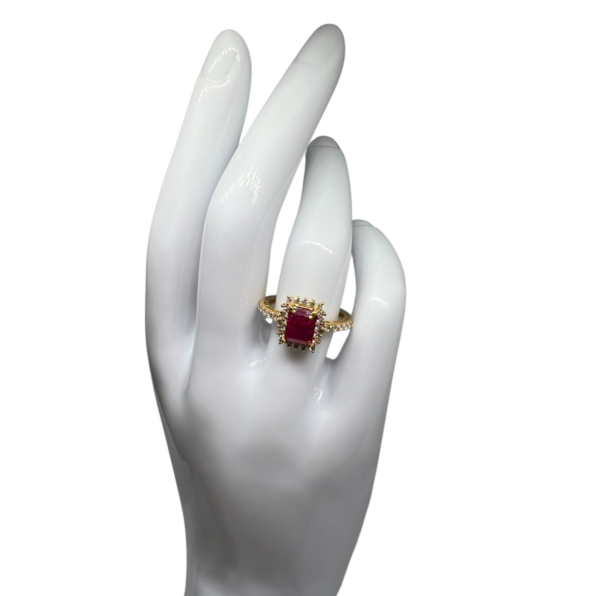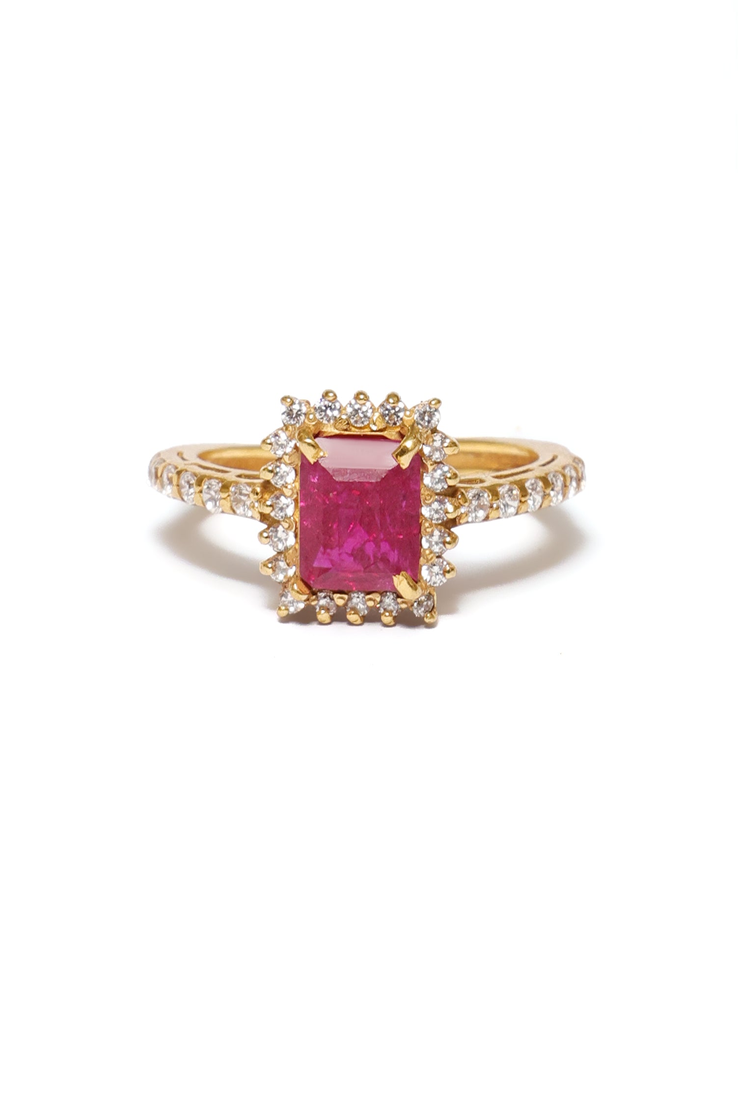 En livlig rød firkantet sten indrammet med en zirkonhalo, sat på en klassisk bånd besat med fine zirkoner – raffineret med et subtilt strejf af elegance.
