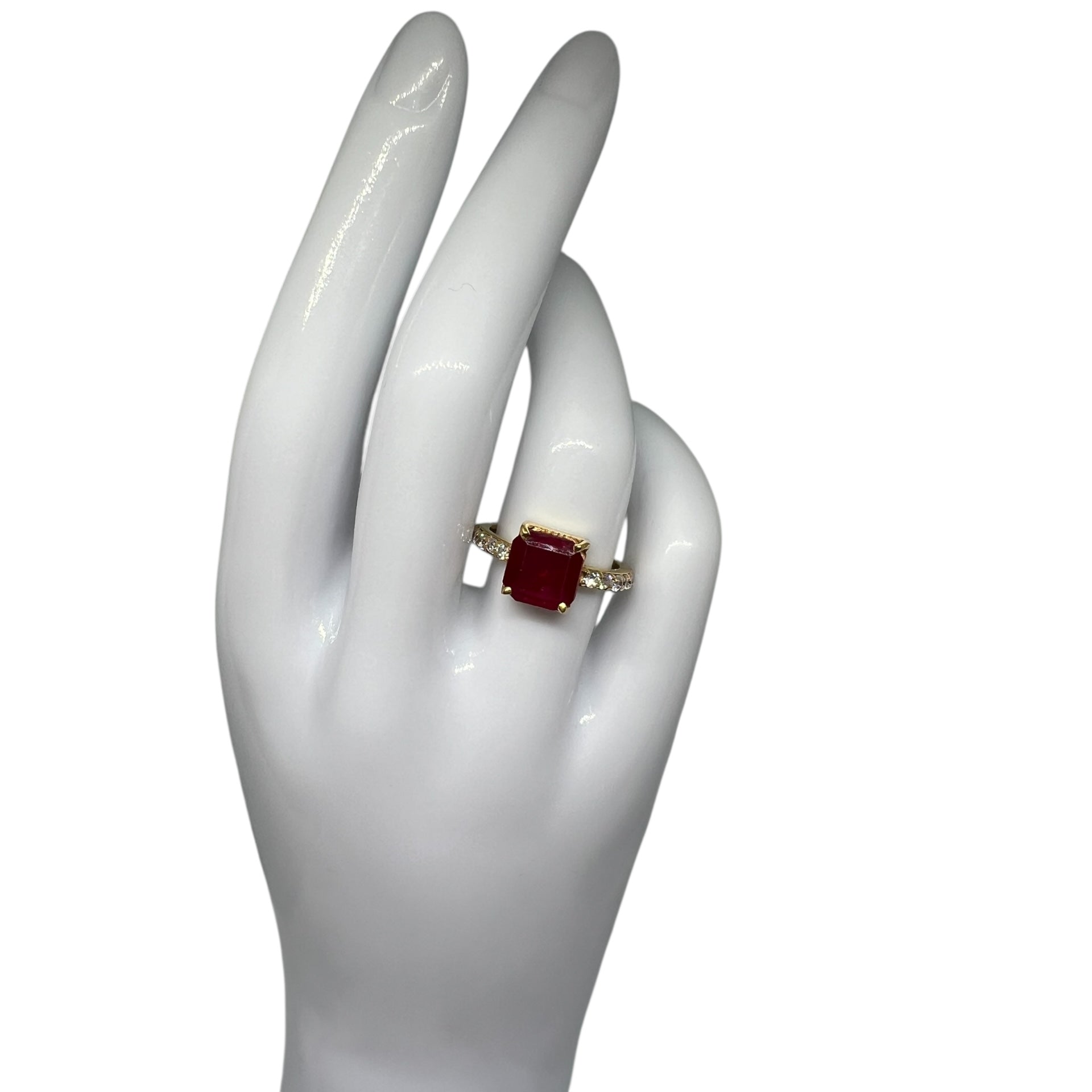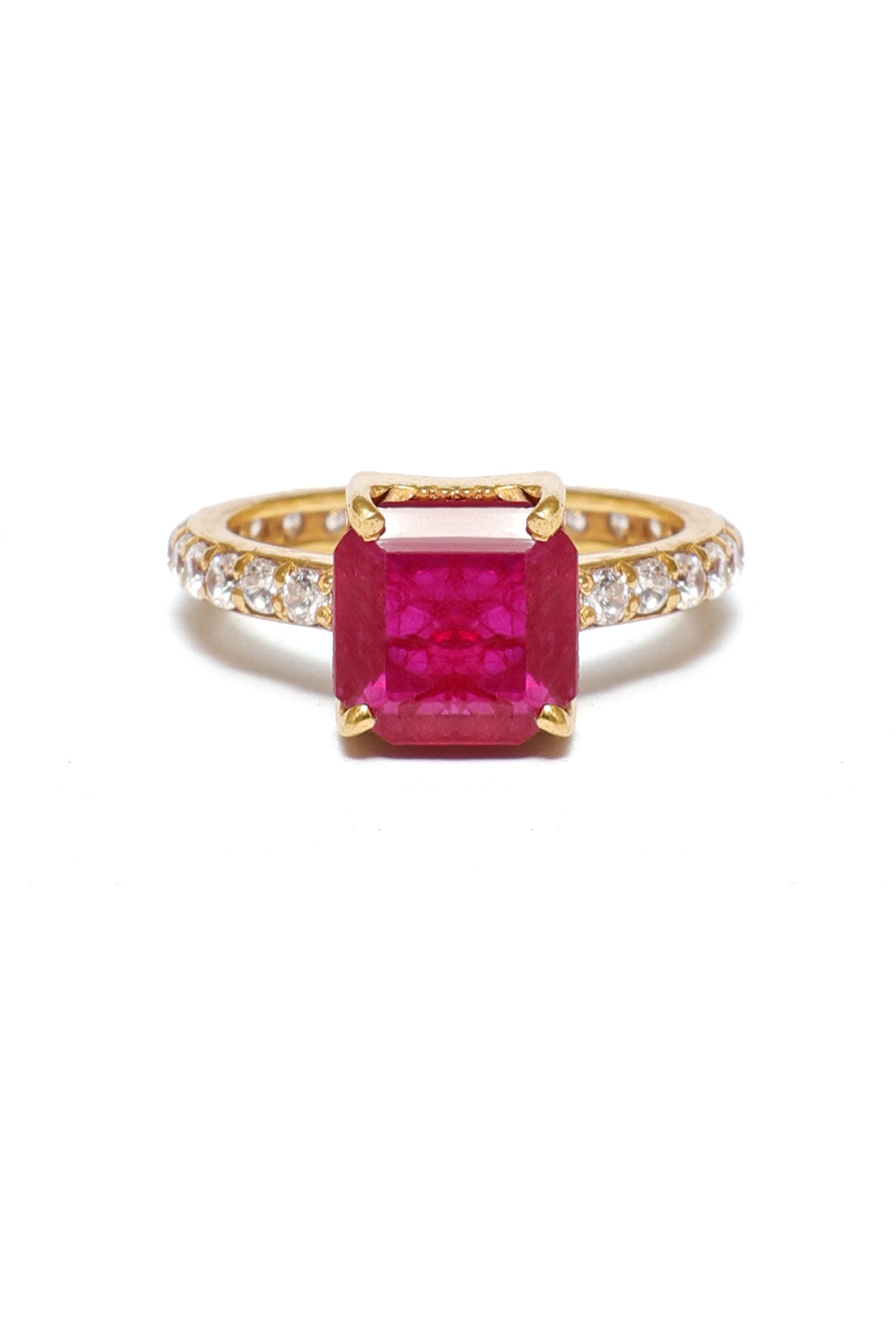 Rød firkantet sten besat med en klassisk zirkonforet bånd – dristig og raffineret i sin enkelhed.