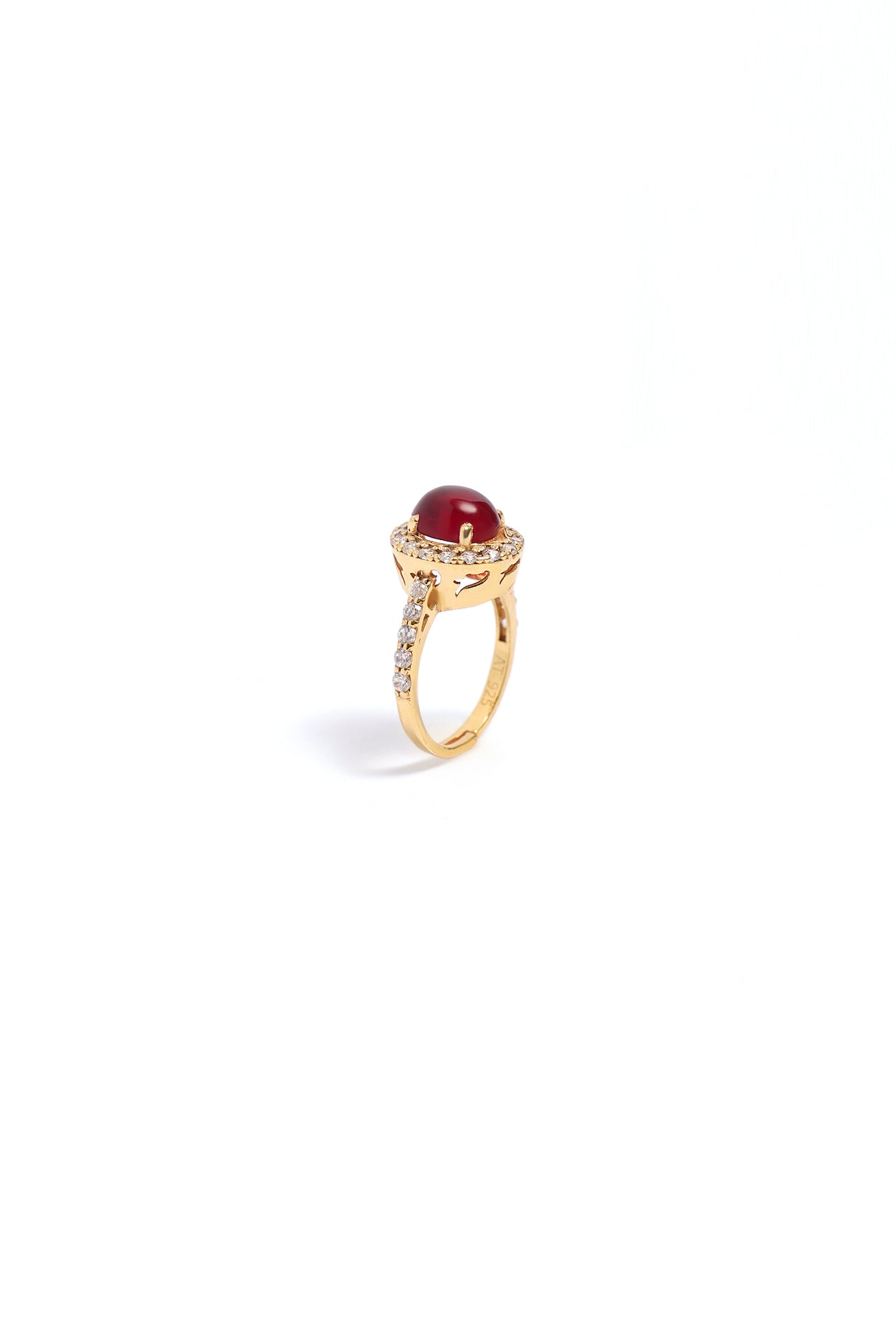 En rød centersten omkranset af zirkoner, med yderligere zirkonaccenter på båndet, der giver et design, der udstråler levende elegance.