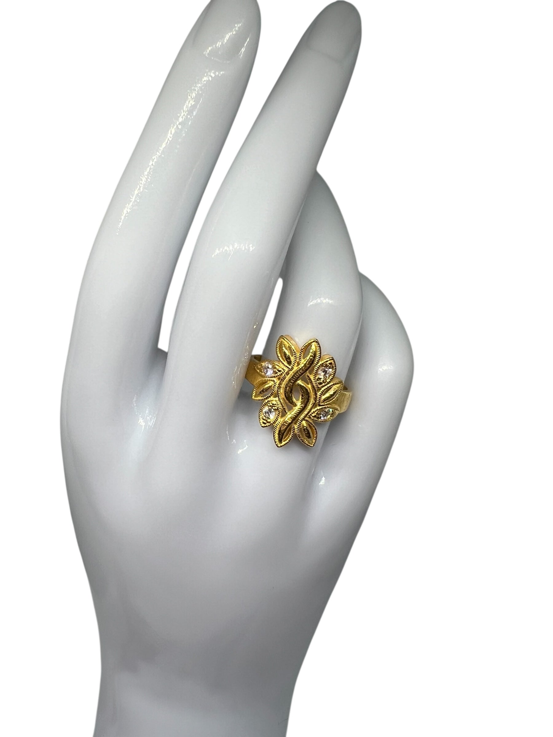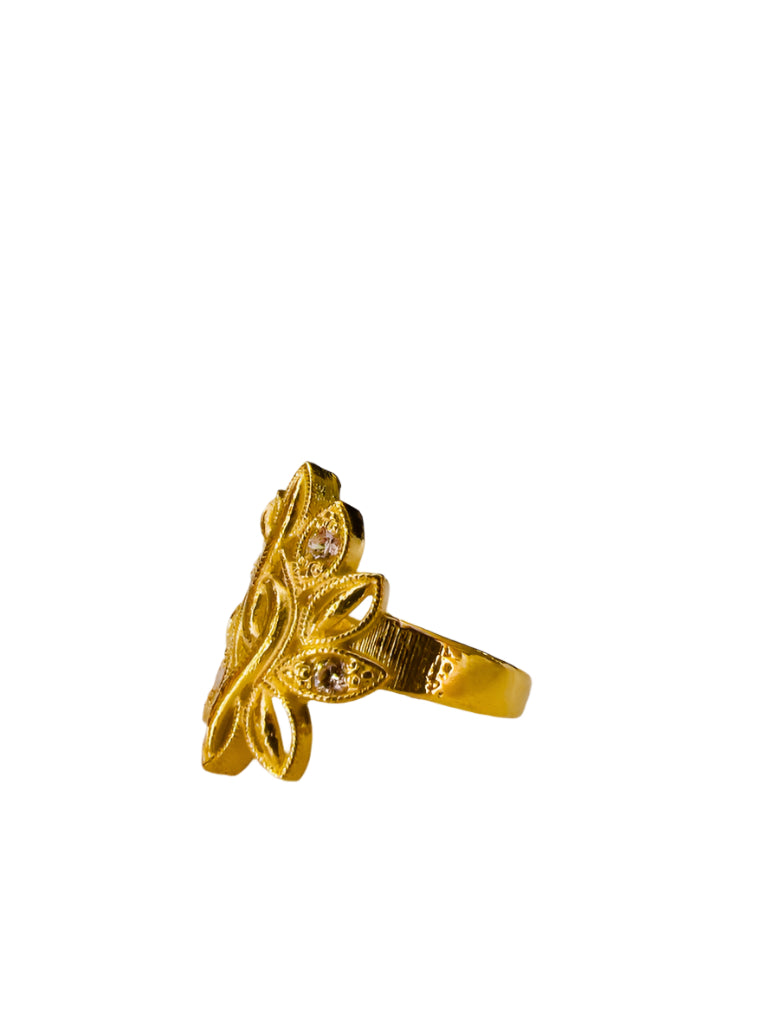 Oplev det udsøgte håndværk af den håndlavede Rosella Ring. Dette fantastiske stykke har et strålende guldbehandlet bånd, prydet med et indviklet skulptureret blomsterdesign og glitrende ædelsten. Hvert kronblad er omhyggeligt udformet til at legemliggøre naturens delikate elegance. Rosella-ringen er et ægte udtryk for tidløs skønhed og er en sofistikeret tilføjelse til enhver kollektion.