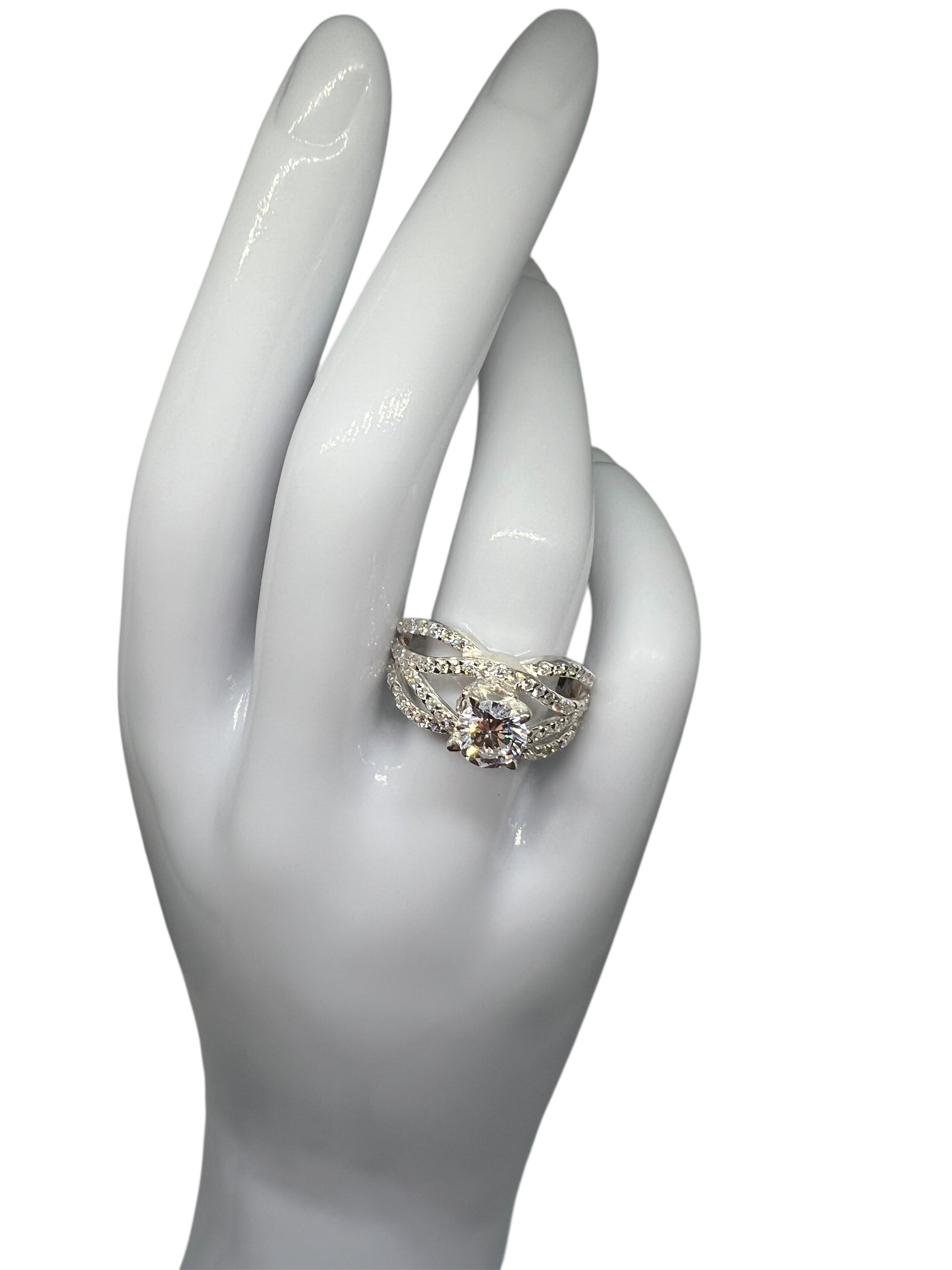 En forhøjet central zirkon, omgivet af et delt bånd udsmykket med zirkoner, der tilbyder et elegant og raffineret design.