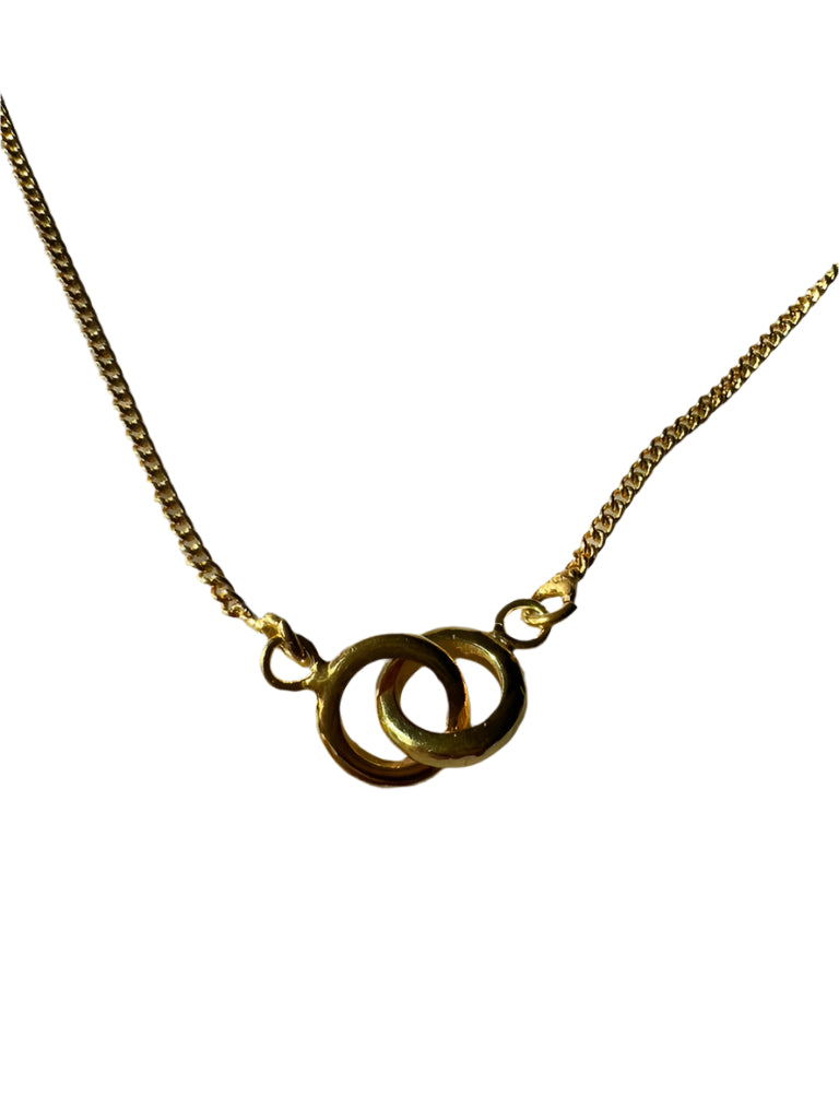 TE: The Eternal Halskæde - Med tidløs enhed og vedvarende elegance symboliserer dette smykke evig kærlighed og forbindelse gennem sine sammenflettede cirkler, der udstråler ynde og sofistikering. Den Evige Halskæde - Lille har de karakteristiske sammenflettede cirkler i et mere raffineret, nedskaleret design.