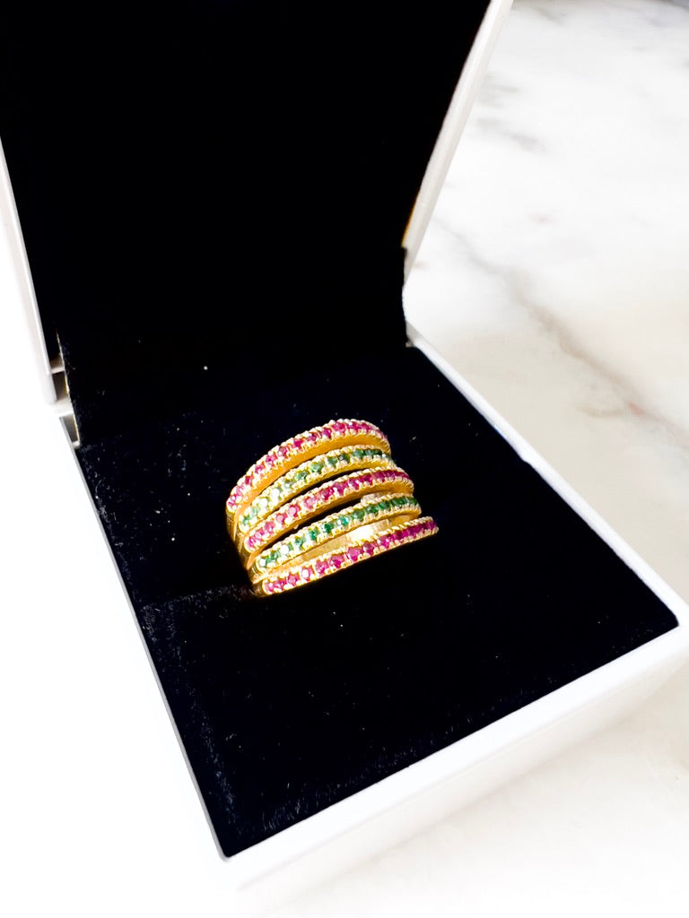Omfavn charmen ved den grønne oase-ring, en fængslende blanding af rige grønne og dybe røde farver, der fremkalder charmen ved en skjult have i blomst. Dette fortryllende stykke fremkalder roen i en hemmelig have, hver ædelsten er nøje udvalgt for sin livlige farve og glans. Den udstråler elegance og charme og er et vidnesbyrd om tidløs sofistikering og naturlig pragt.